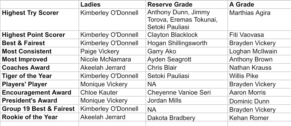 In ladies league Tag, Kimberley O’Donnell capped off her year by claiming the Club’s B & F, Highest Try Scorer, Highest points scorer, Tiger of the Year awards.